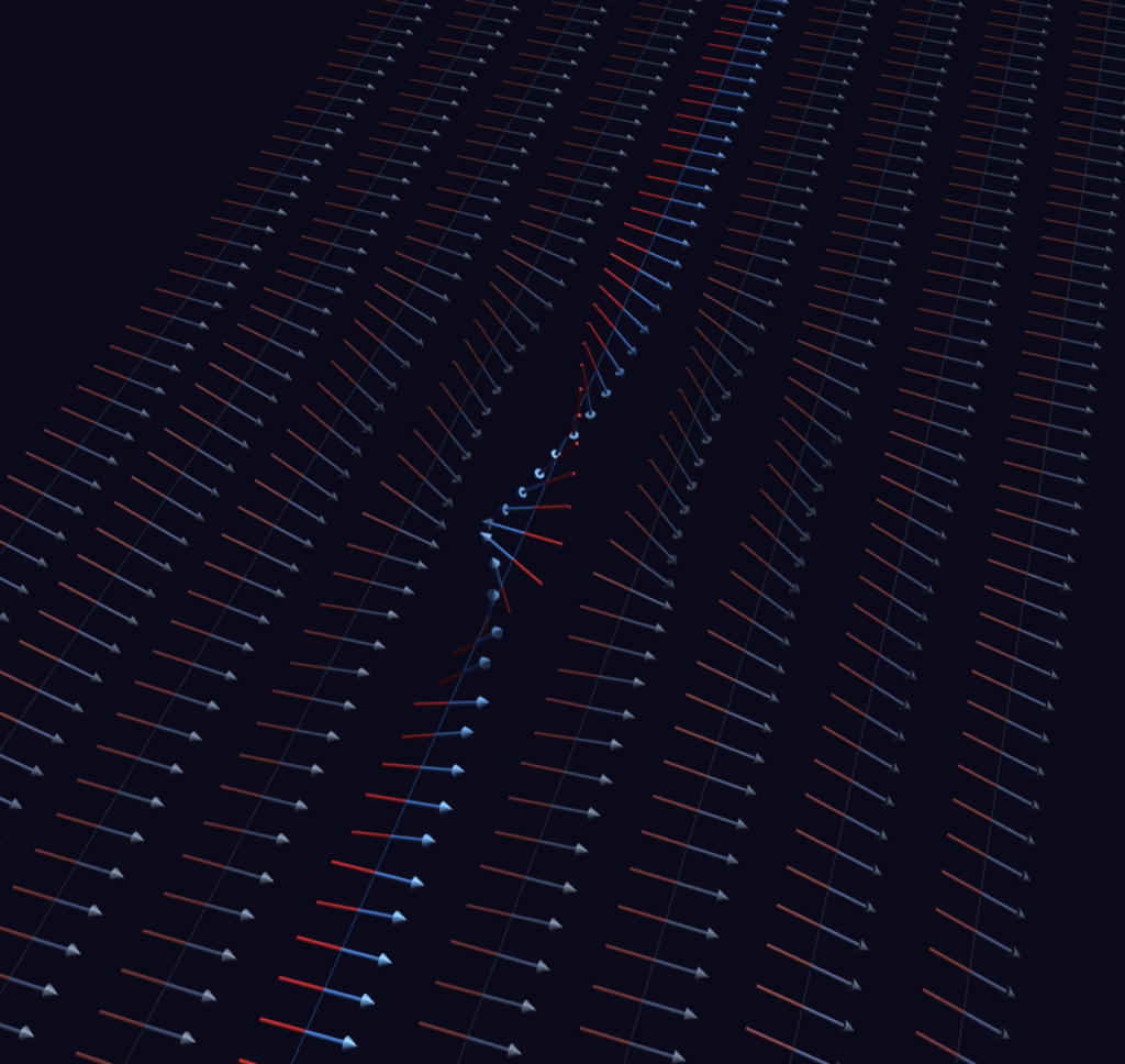 [Figure: A vector field consisting of arrows. The arrows are lined up in parallel ribbons. The center ribbon shows a full twist (arrows going around 360°), slightly affecting the neighbors, with a flat field before and behind the twist.]